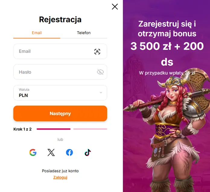 2. Wybierz najwygodniejszy sposób rejestracji: przez e-mail, numer telefonu, media społecznościowe (Google, Twitter (X), Facebook, TikTok).